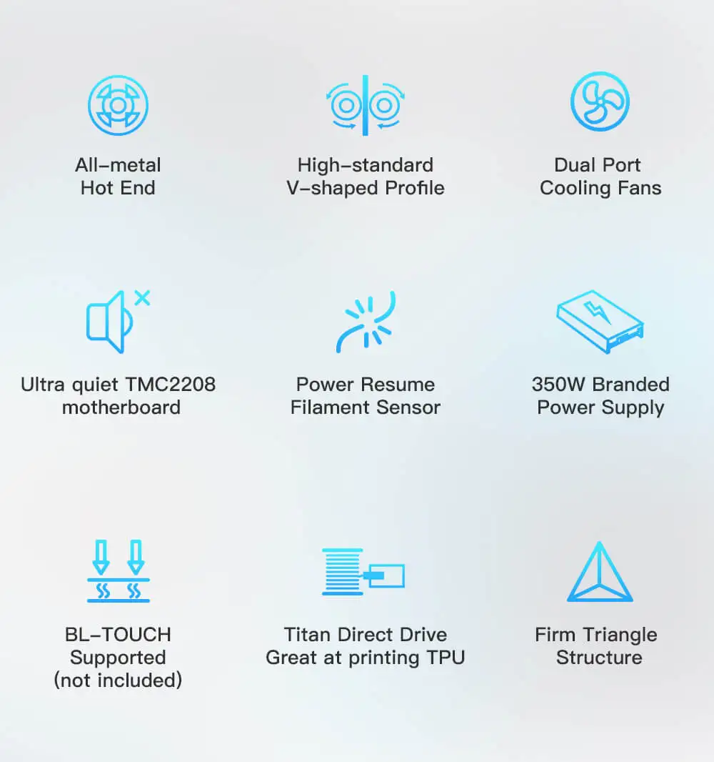 Titan Direct Drive Precise And Smooth ExtrusionEquipped with genuine Titan direct drive, the torque of the stepper motor is lower, It’s more precise to control the feed-in flament,